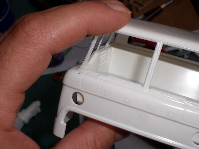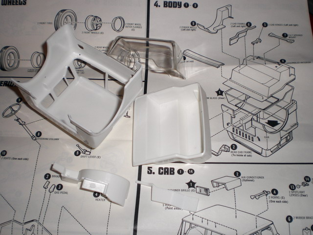 Es gibt keine einzelnen Fenster, sondern nur ein großes, dickes, sprödes Klarsichtteil. Die Türverkleidung ist in die Fahrerhauswanne "integriert". Radkasten und "Treppe" geben dem ganzen den nötigen Seitenhalt und abschließend gibt es noch einen Träger.