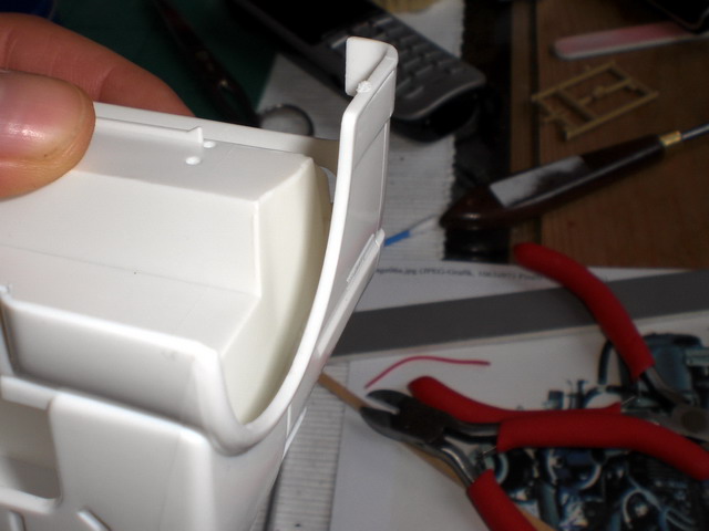 Wenn ich das also durchziehen wollte, müsste ich das große Klarsichtteil zersägen, die Wanne zersägen, die Türen aussägen (als Rahmen übrig blieb unten nur 1mm, der allerdings vom Radkasten stabilisiert würde, trotzdem natürlich eine heikle Arbeit). Dann müsste ich mit PE Platte die Tür und die Verkleidung zu einer richtigen Tür zusammen bringen, was aufgrund der geschwungenen Karosserie für mich als blutigen Anfänger sicher nicht ganz einfach wird.