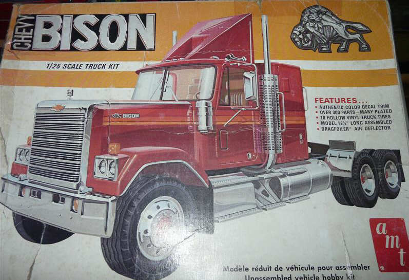 So, der Bausatz ist alt, aber komplett, wie gesagt bis auf die Reifen, da fehlen 8 aber den AMT Kram will ich eh nicht aufziehen, da werde ich mich mal mit Revellgummis versuchen. Und weil ich gerade mal wieder Bock auf einen LKW hatte, noch nie einen AMT Bausatz gebaut habe und dat Dingen ja auch schon ein bißchen angefangen war, habe ich gedacht: Komm, den machste jetzt mal direkt fertich.