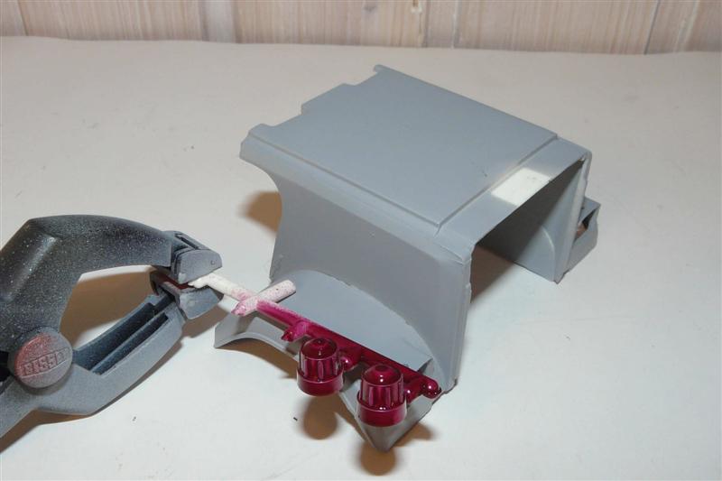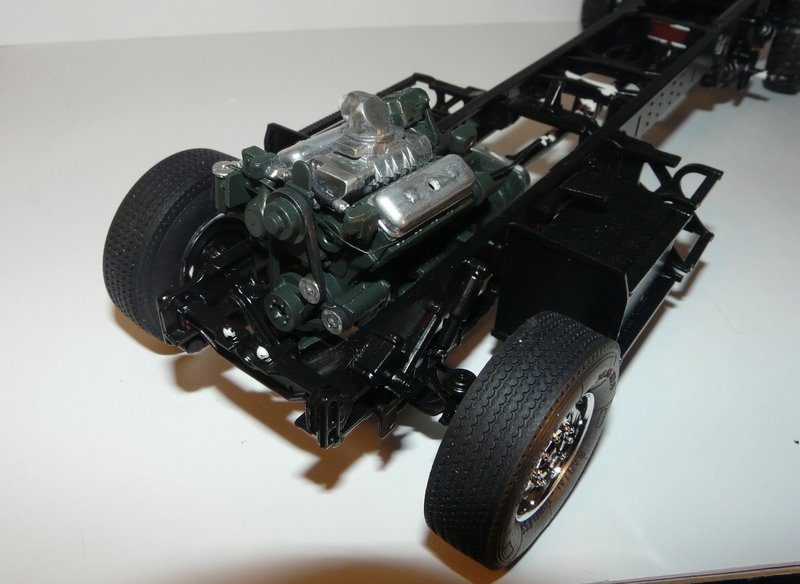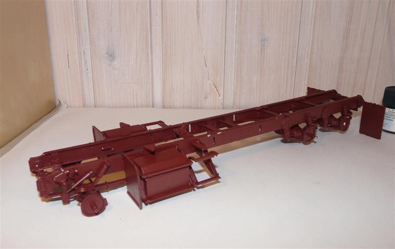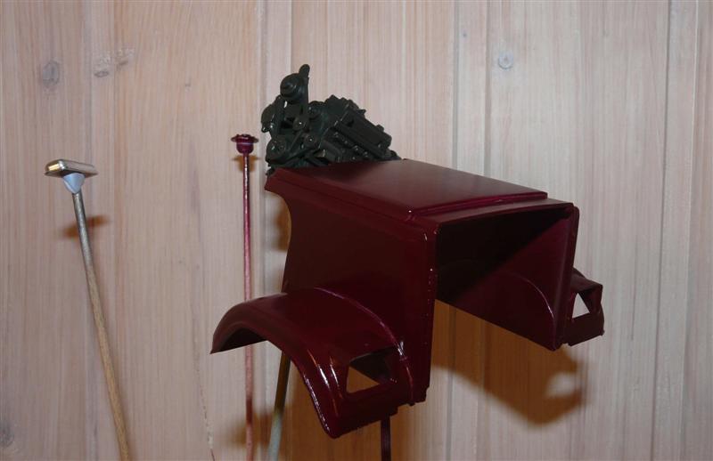 So dann habe wir die Haube grundiert und lackiert, Farbe wird Maroon von Tamiya. Die sieht im ersten Durchgang ein bißchen Rosa aus, aber mit der Zeit und der Lackdicke wird das schon. Motor ist Dunkelgrün, da habe ich etwas im Netz gewühlt, das steckt(e) ein Detroit Diesel V8 92 irgendwas drunter und die habe ich überwiegend in Hell- bis Dunkelgrün gefunden. Gab allerdings auch einen in Rot, das war mir dann aber zu wenig Kontrast.