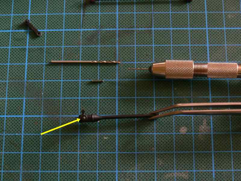 Leider war an der Lenksäulen-, Lenkgetriebe Einheit, der Bolzen zum vernieten des Lenkgestänges abgebrochen. Ich habe das Teil zwar im Karton gefunden, aber festkleben wird auf Dauer nicht halten. Also habe ich mir da was aus meiner Grabbelkiste heraus gesucht, was den Bolzen ersetzen konnte. Nun mit einem 0,8mm Bohrer vorgebohrt und dann auf 1mm erweitert und der neue Bolzen konnte eingeklebt werden.