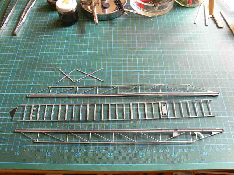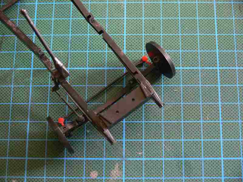 Dann wurden diese beiden roten Hebel, hinten, im Fahrgestell, beweglich, vernietet, warum das so im BP vorgesehen ist entzieht sich aber meiner Kenntnis. Danach wurden die beiden roten Rechtecke angeklebt und es kamen noch vier Querstreben dazu, die von außen angeklebt und unter dem Rahmen hindurch gehen. Das alles dient später dem Abstützen der Karosse am Rahmen.