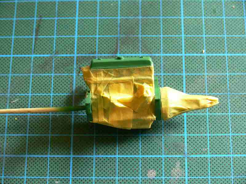 Nun noch ein bisschen Spachteln und verschleifen und es kann zum Waschen gehen, aber halt, vorher habe ich noch Spritzlinge angebracht, die mir später das ganze bei der Lackierung halten, bzw. damit können sie auch zum trocknen in einen Styroporblock gesteckt werden.