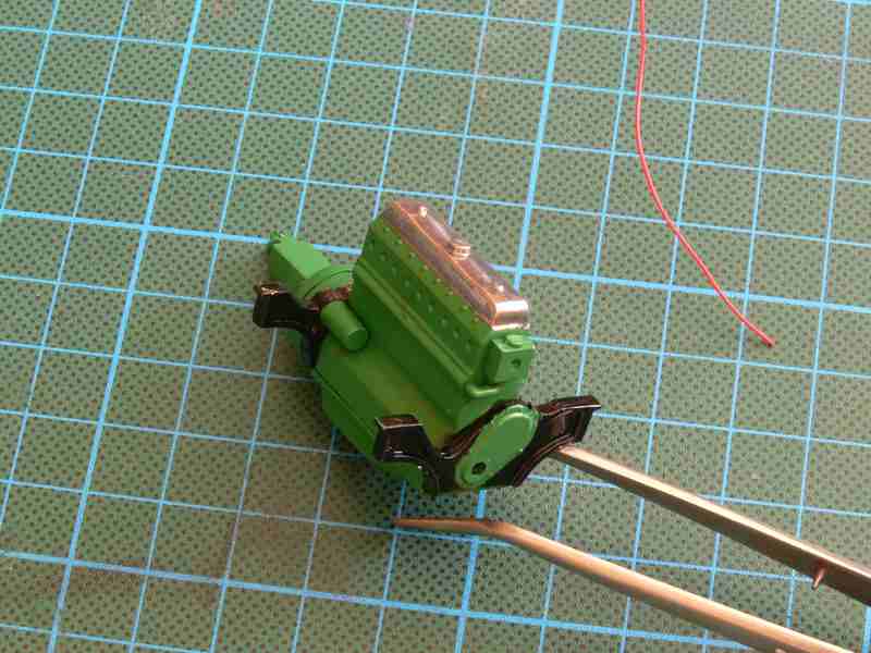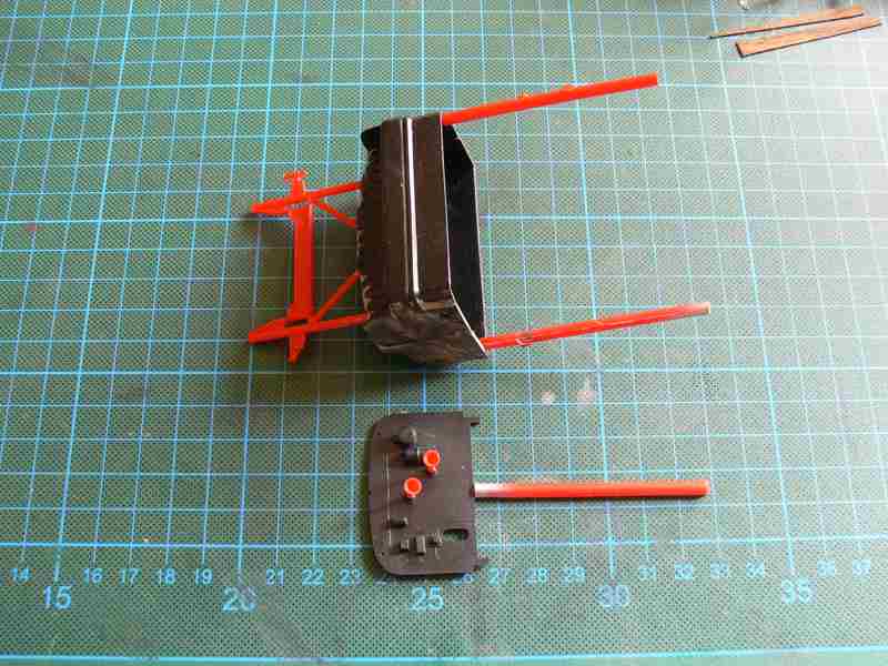 Dann habe ich diese beiden roten Tröten an die Spritzschutzwand geklebt, ich denke mal es sind die Fanfaren des französischen Sondersignals, auch der Kühler war dann mittlerweile fertig.