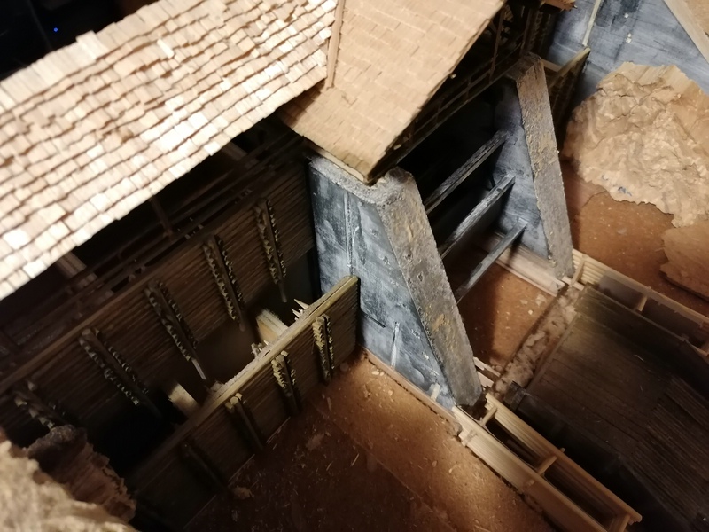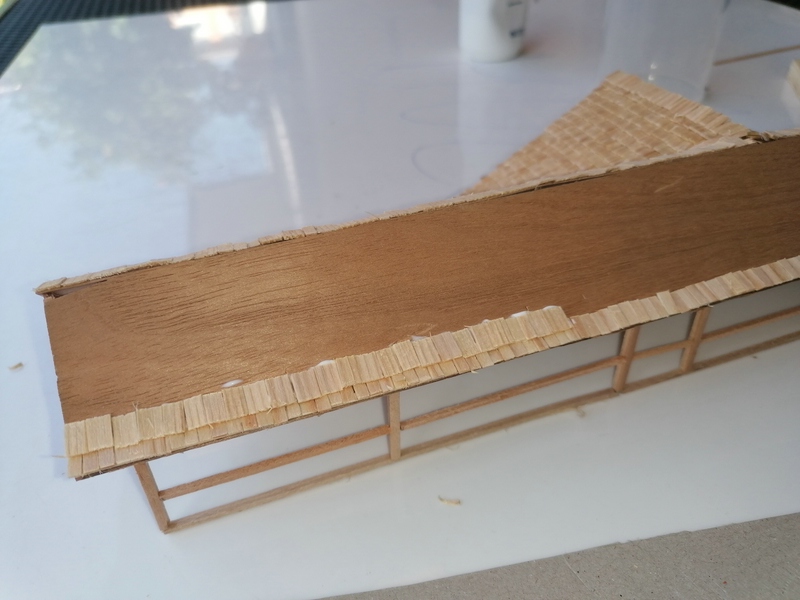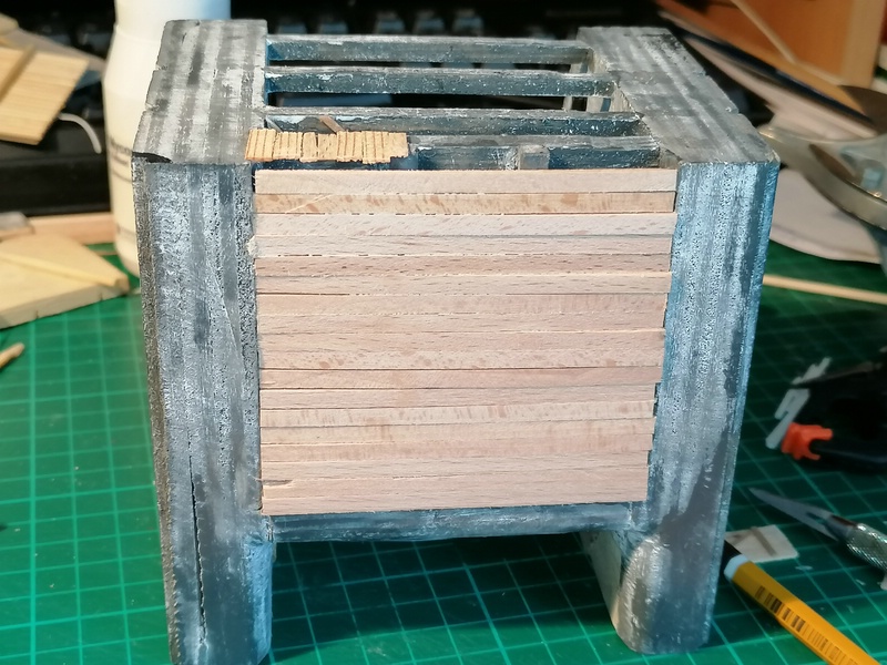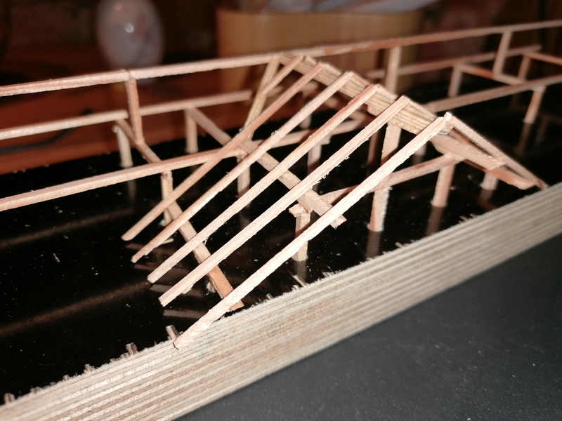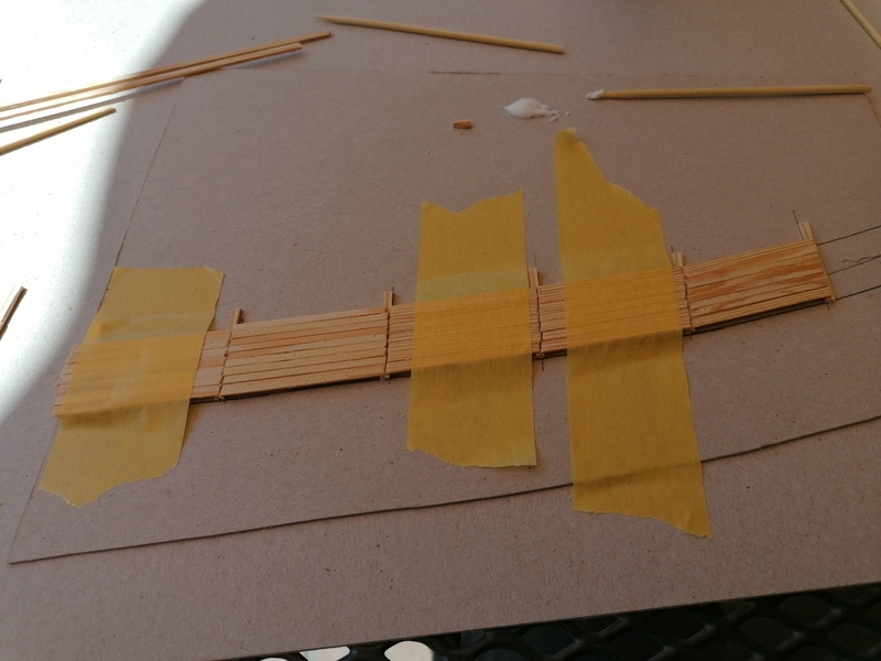 Nun, diese Holzplanken habe ich auch mit sehr dünnen Brettchen zusammengeleimt und mit den Stehern und Verstrebungen versehen.