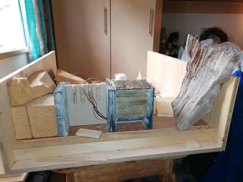 Auch die Anschlüsse für die Beleuchtung habe ich schon profisorisch verbunden. Die Holzwände links und rechts des Haupttores habe ich inzwischen auch gebeizt. Nur das "Gelände" mit dem Weichfaserklotz gefällt mir hier überhaupt nicht! :!!
