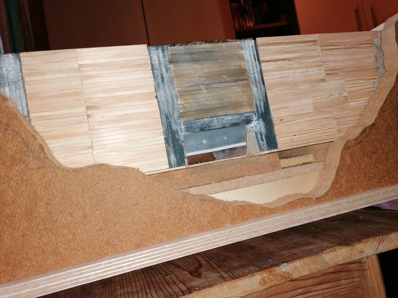 Ich hoffe, dass man es hier erkennen kann! Auch die beiden Flanken entstanden auf diese Weise. Ich habe hiefür Kartonplatten verwendet und die Hölzer darauf geleimt. Wird oben mit Bodenbretter versehen und somit ist auch von oben nicht mehr einsehbar.