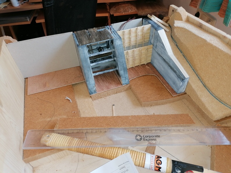 Also die Rinne aus dem Haupttor ist inzwischen auch gemacht und auch die Kästen auf beiden Seiten habe ich gezimmert. Ist mit diesen kleinen Hölzern immer eine kleine Fummelei! :pfeif: