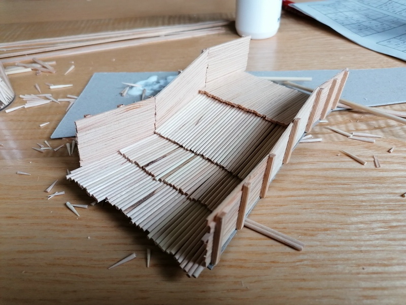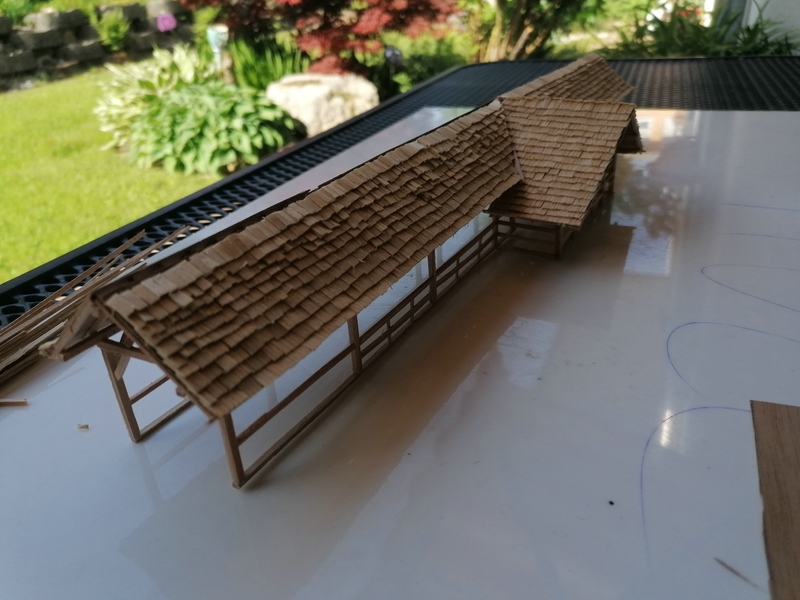 Als nächstes kam eine recht zeitaufwendiger Abschnitt: Das Decken des Daches mit Holzschindeln.
