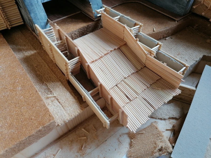 Als nächstes habe ich das Gerinne des Grundablasses mit kleinen Brettchen und Stehern zusammengebaut. :)
