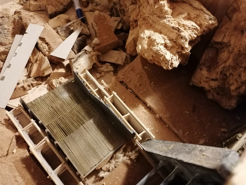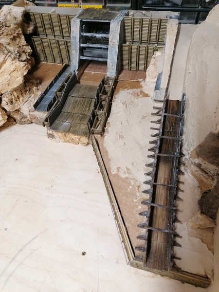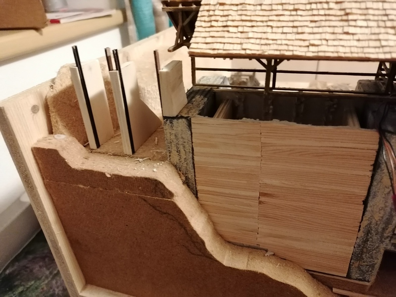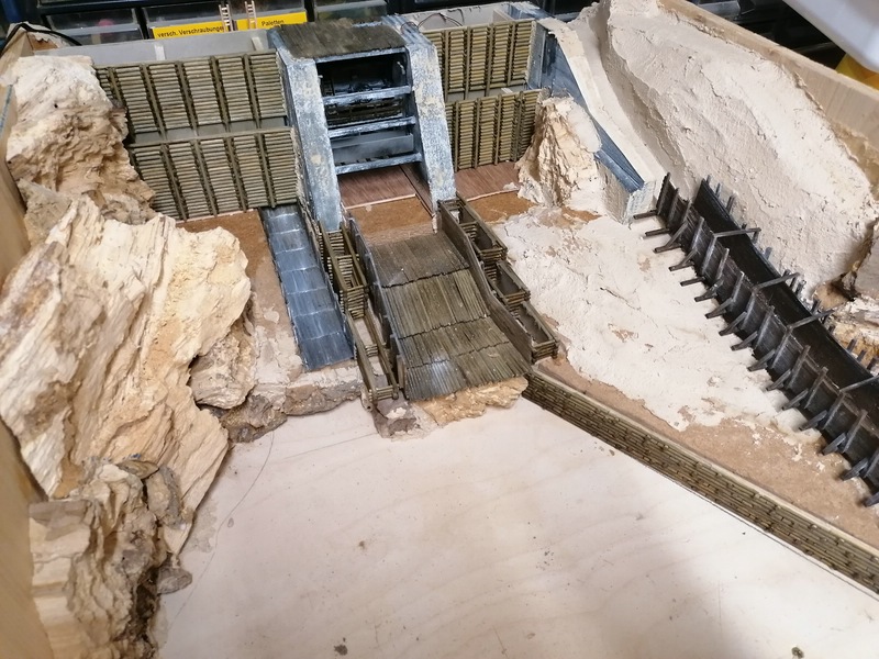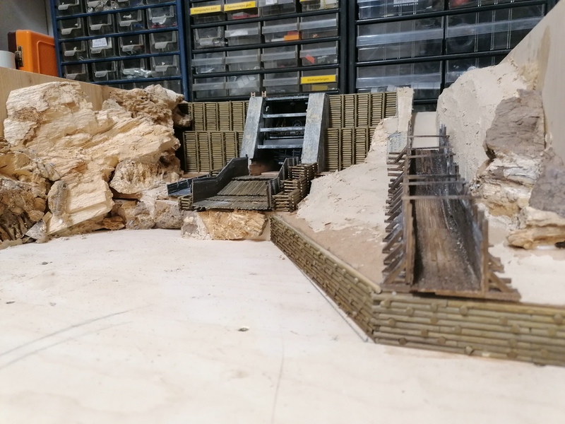 Auch auf der linken Seite der Staumauer habe ich die Holzwände aufgestellt. Hier habe ich sogar etwas zu viel gezimmert, weil ich erst hinterher draufkam, dass hier einiges hinter der Felswand verschwindet. :motz: :motz: