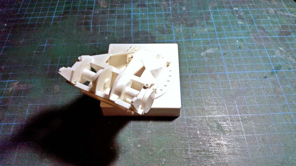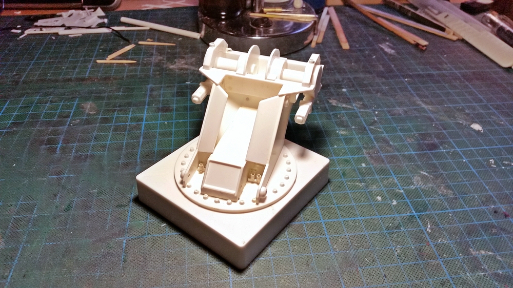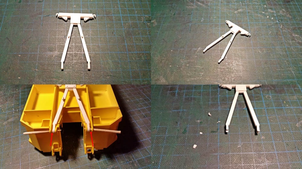 Nun nur noch ankleben, sieht aus wie Sekundärgeschütze zu den Hauptwummen (die zwei Hydraulikzylinder) :grins: und der Kranfuß ist nun fertig zum Lackieren, wurde ja auch langsam Zeit. :abhau: