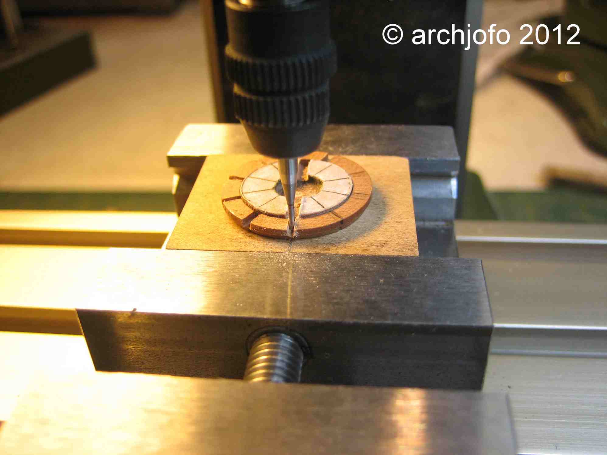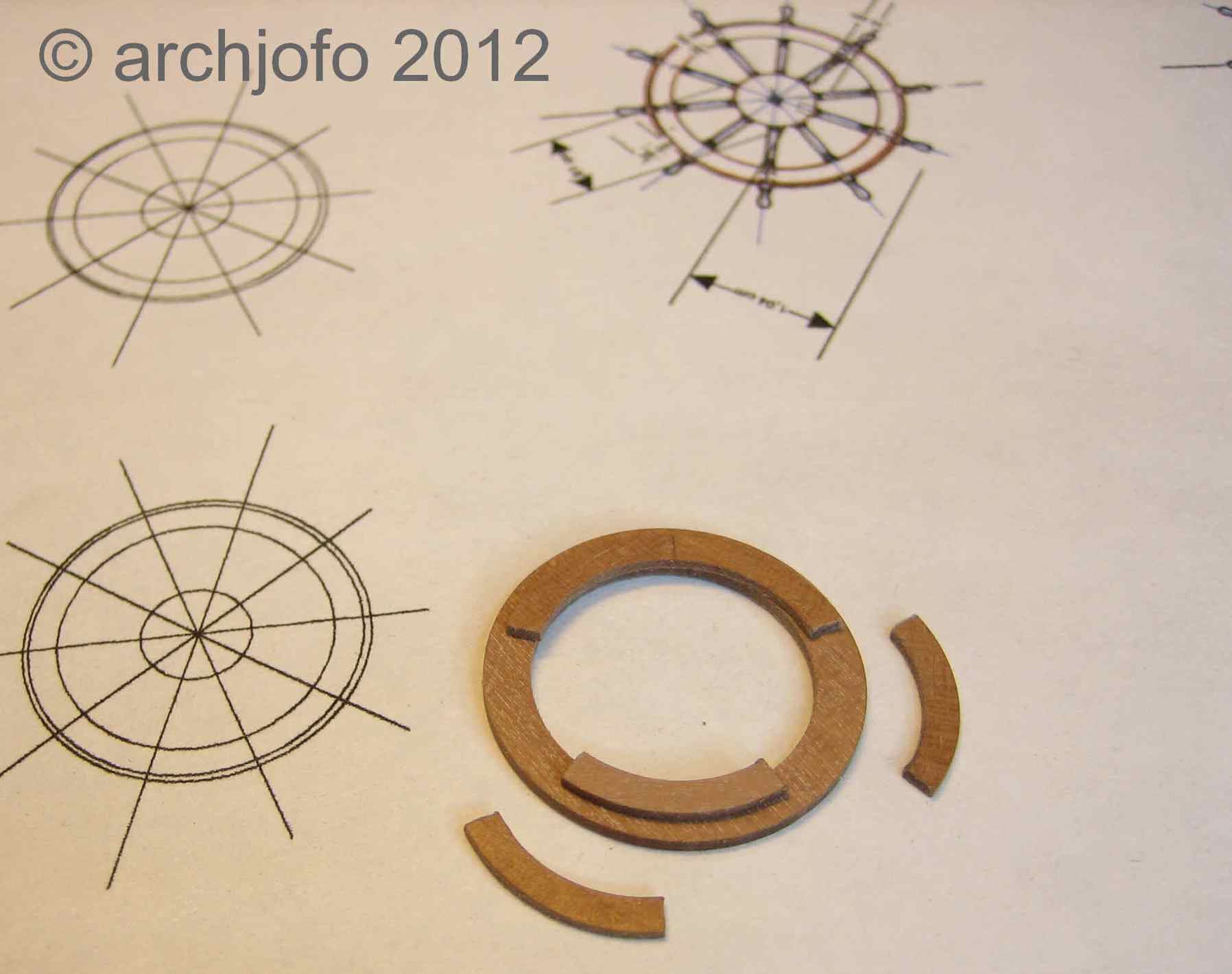 Vor der Ausführung habe ich in Büchern und im Internet nach einer passenden Herstellungsmöglichkeit gesucht. Letztlich läuft es immer darauf hinaus, dass man es mehr oder weniger Zusammenbaut wie ein Originalsteuerrad. Was ich beim letzten Bau des Steuerrades vor etwa einem Jahr noch für nicht möglich gehalten habe gelingt mir nun hoffentlich. Hier die ersten Bauabschnitte. Um ein möglichst realistisches Aussehen des Steuerrades zu erhalten, sind u. a. auch der Maserungsverlauf und die Segmentteilung des Radlaufes mit den äußeren Abdeckungen zu beachten. Insofern habe ich daher die Segmente aus einem Birnbaumholzbrettchen hergestellt und dann verleimt. In bewährter Weise schnitt ich dann aus der rund geschliffenen Holzscheibe die äußeren Radlaufabdeckungen mittels Schnitzmesser und Feinbohrschleifer exakt den Planvorgaben aus.