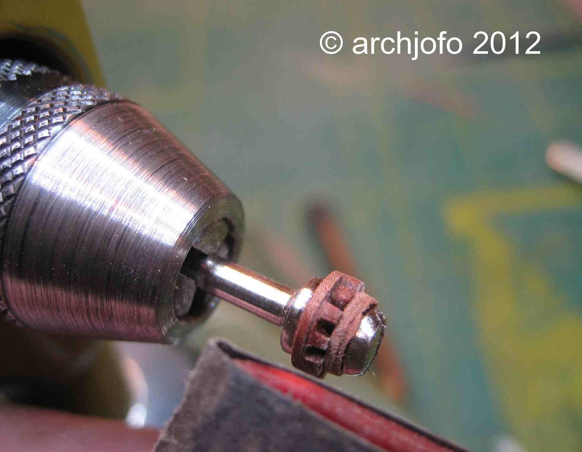 Die Speichen werden aus 1 mm Birmbaumholzleisten am Feinbohrschleifer „gedreht“. Hierzu brauchte ich ebenfalls mehrere Versuche bis mir die erste brauchbare Speiche gelang. Im Bereich des Radlaufes muss die Speiche einen quadratischen Querschnitt haben, um dann entsprechend zwischen die Radlaufsegmente und die Radlaufabdeckungen eingesetzt werden zu können