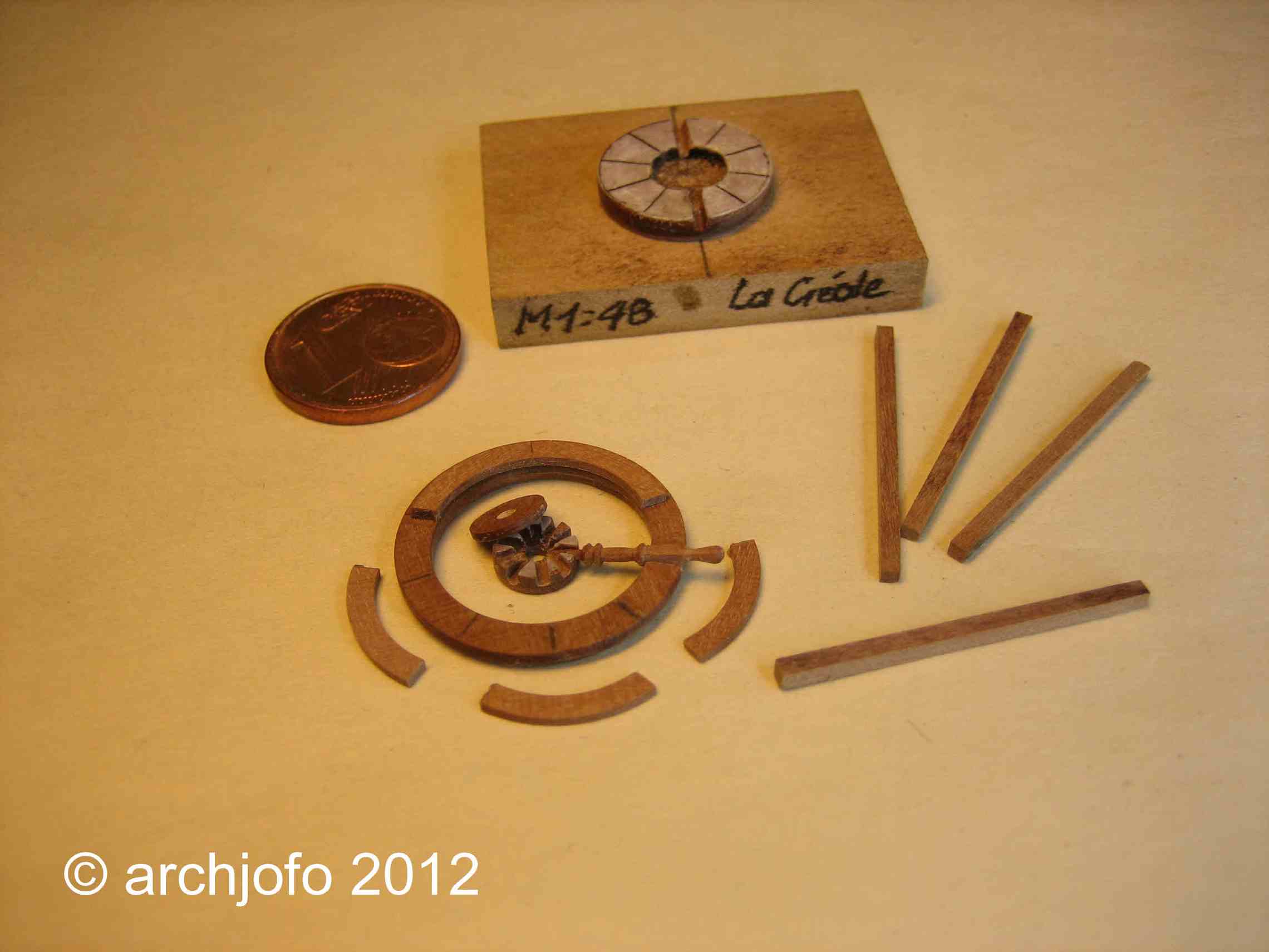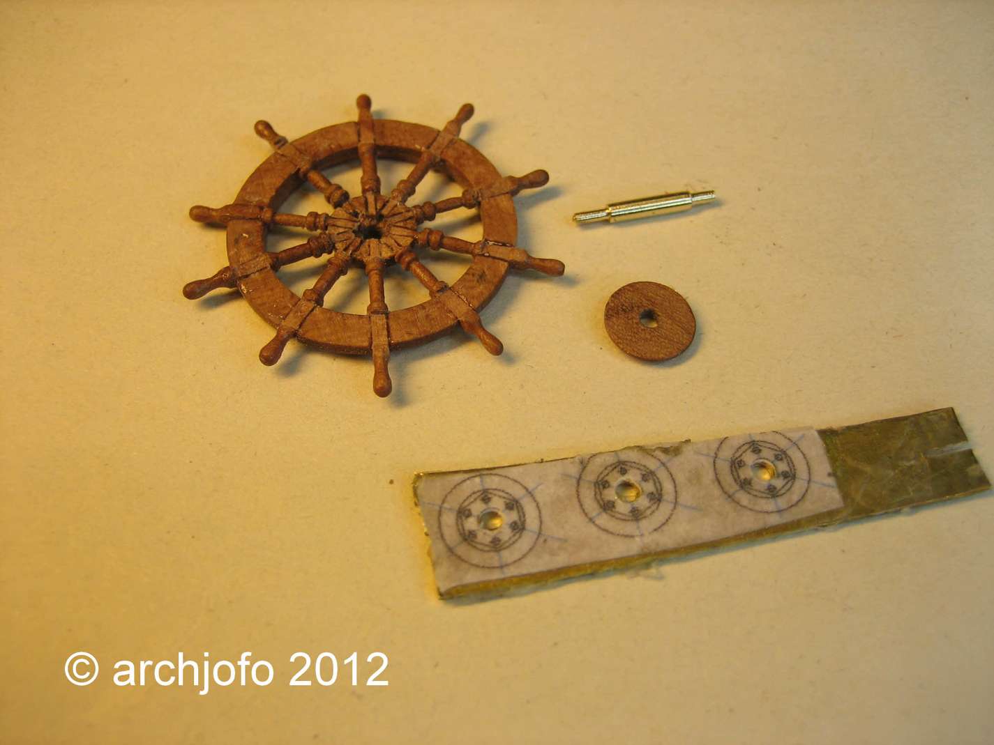 Auf diesem Bild ist nun auch zu sehen, wie letztlich die Montage des Steuerrades erfolgen wird. Im Wissen, dass es nun so funktionieren kann, muss ich nur noch 9 Speichen anfertigen, um dann die finale Montage des Steuerrades vornehmen zu können.