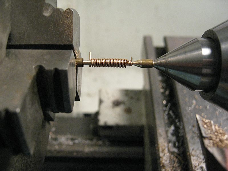 Die Feder läuft nach hinten in eine 1mm Zapfen aus, weil sich dort die Schraube verklemmt welche zum Spannen der Feder dient. Deshalb muß nach der Wickelei die Hifsspitze entfernt werden damit die Feder vom Wickeldorn entfernt werden kann. Bedeutet natürlich..... für jede Feder muß ein neuer Dorn angefertigt werden.
