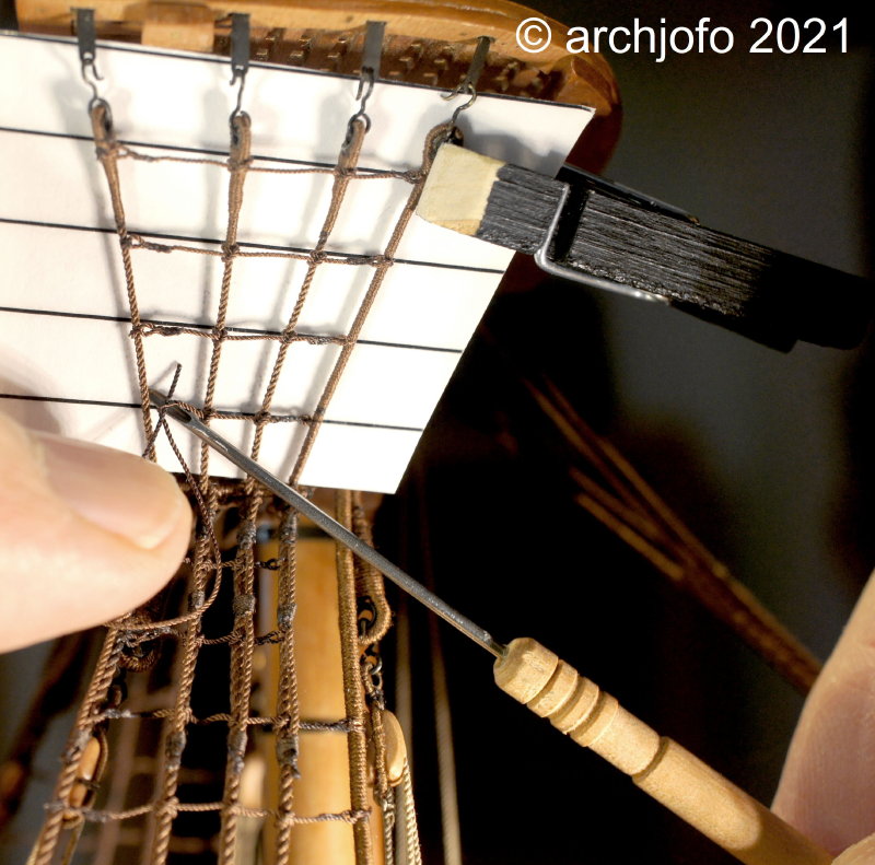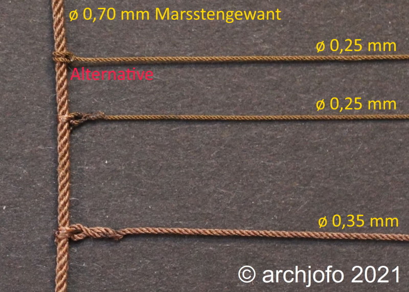 Nach mehreren Versuchen und interessanten Diskussionen im Forum entschied ich mich letztlich die Webleinen der Unterwanten meines Modells mit ø 0,35 mm (entspricht im Original ø16,8 mm) auszuführen. Im Nachhinein hat sich diese Entscheidung als völlig richtig erwiesen. Die Webleinen mit ø 0,43 mm (ø 21 mm im Original) entsprechend den Angaben der Monographie von Jean Boudriot am Modell ausgeführt, würden nämlich zu mächtig in Erscheinung treten.