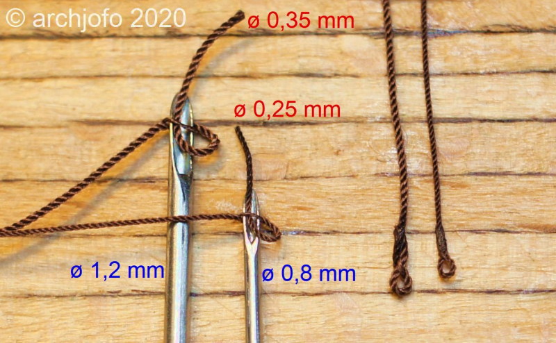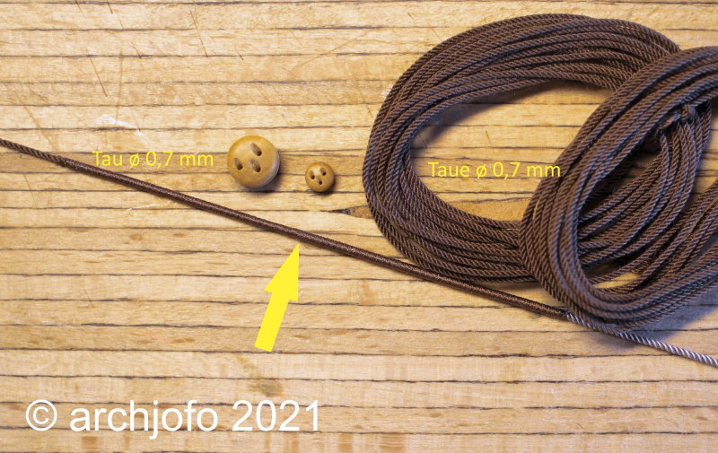 Mittlerweile ist es mir auch möglich ein Tau mit ø 0,7 mm zu trensen. Wie schon vor längerer Zeit einmal nachgewiesen und hier in meinem Bericht gezeigt, sieht ein vorher getrenstes Tau nach dem Bekleiden runder und gleichmäßiger aus, und kommt so der Realität näher.