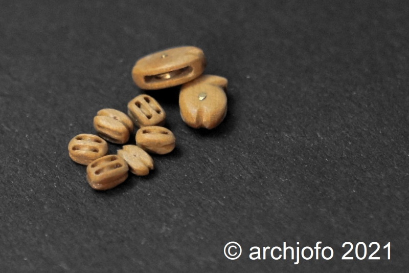 Bei den hierzu angefertigten 1-fach - und 2-fach – Blöcken mit einer Länge von etwa 3,5 mm werden die Scheiben nur angedeutet. Bei größeren Blöcken, wie auf dem nächsten Bild zu sehen, werden Scheiben aus Messing eingesetzt.