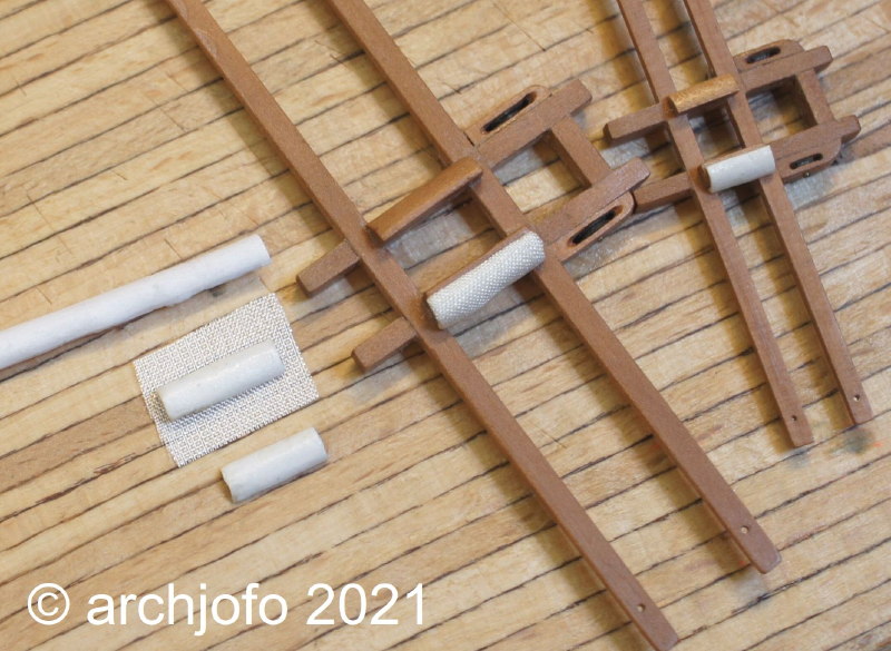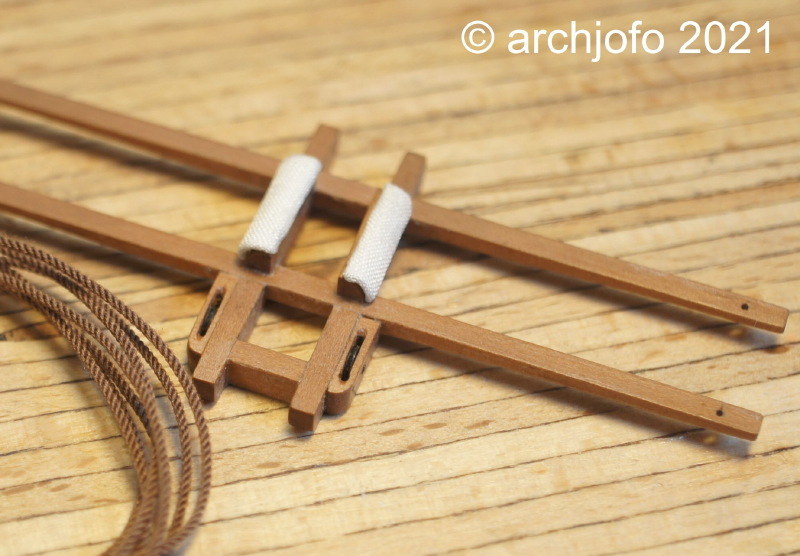 Die Hanger für die Großbram- und die Fockbramsaling habe ich fertiggestellt. Diese werden bekanntlich als erste auf die gepolsterten Kalben aufgelegt. Danach folgen die Wanten.