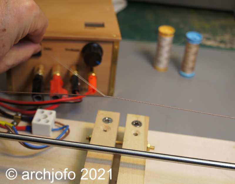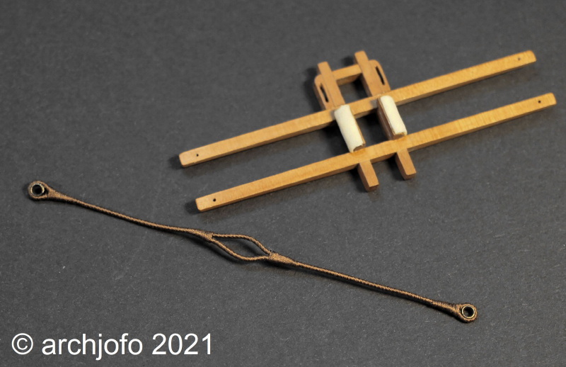 Zwischenzeitlich bereite ich die Taue für die Großstenge- und Fockstengewanten vor. Diese Taue habe ich auf meiner Reeperbahn geschlagen; so die Taue für die Großstengewanten mit ø 0,7 mm aus Gütermann S 303 (3x3) und die für die Fockstengewanten mit ø 0,66 mm aus feinem japanischem Seidengarn Yli (7x3).