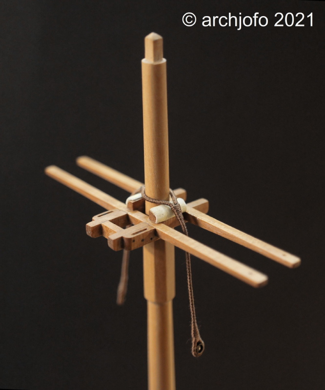 Nach den letzten Arbeiten an der Fockmars geht es für die Herstellung des stehenden Gutes der Korvette eine Etage höher zu den Stengen.