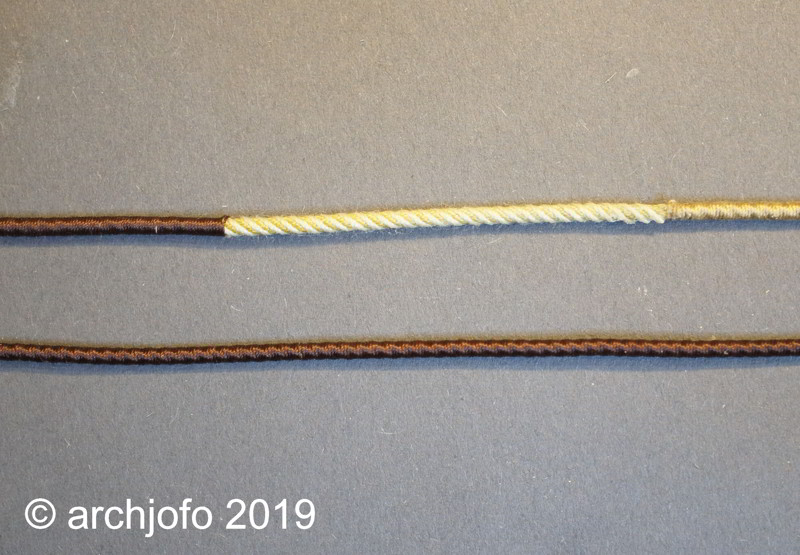 Jedoch ist feststellen, dass dieser Effekt nur bei dickeren Tauen positiv in Erscheinung tritt. Wie nach meinem Versuch mit einem Tau ø 0,7 mm auf dem folgenden Bild zu sehen ist (getrenst ab Pfeil nach rechts), kann ich fast keinen Unterschied erkennen. Im Gegenteil, das getrensteTau erscheint wohl nach dem Bekleiden etwas dicker. Daher werde ich auf das Trensen in diesem Fall verzichten.