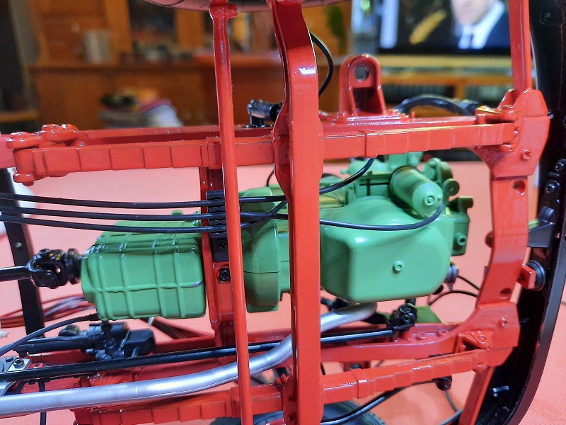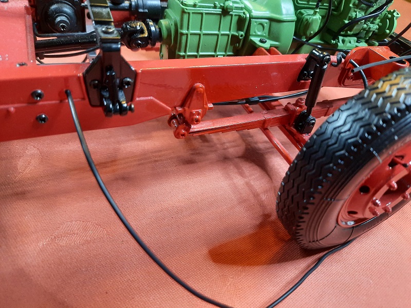 ganz hinten am rechten vorderen Längsträger 7A. Das andere Ende der Leitung bleibt vorerst frei" - an vorgesehener Stelle hatte mein Rahmen aber keinen Zapfen, sondern eine kleine Bohrung ! Ich habe in dieses Löchlein von der Innenseite des Rahmens einen 1 cm langen konischen Metallstift eingepreßt und dann daran außen die Leitung befestigt...