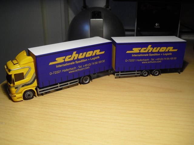 hallo leute, hier hab ich noch ma ein scania von der spedition schuon, hab ihn noch ein lampenbügel verpasst und die felgen etwas eingeschwärzt das alles besser betont is, noch schnell kennzeichen ausgedruckt und fertig is der hobel.....