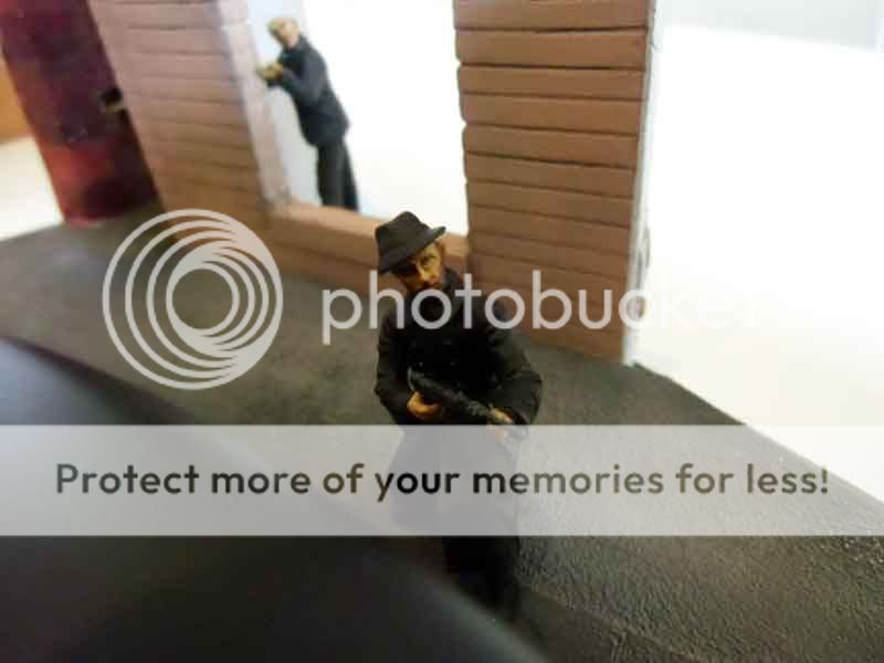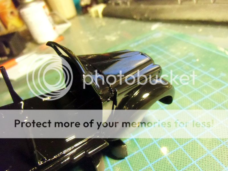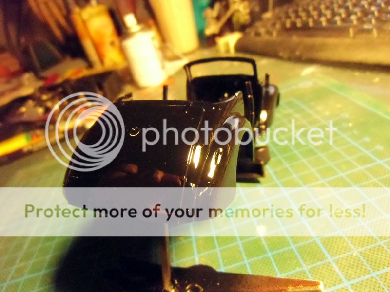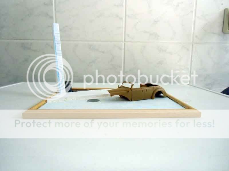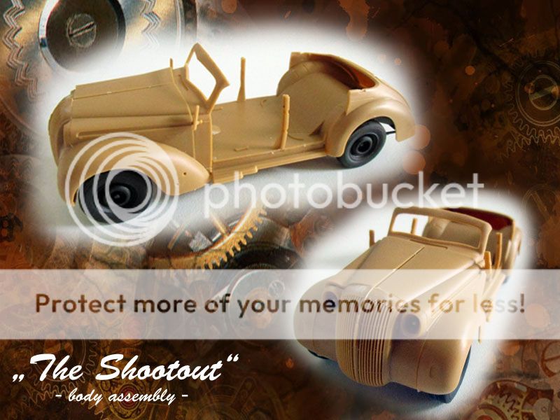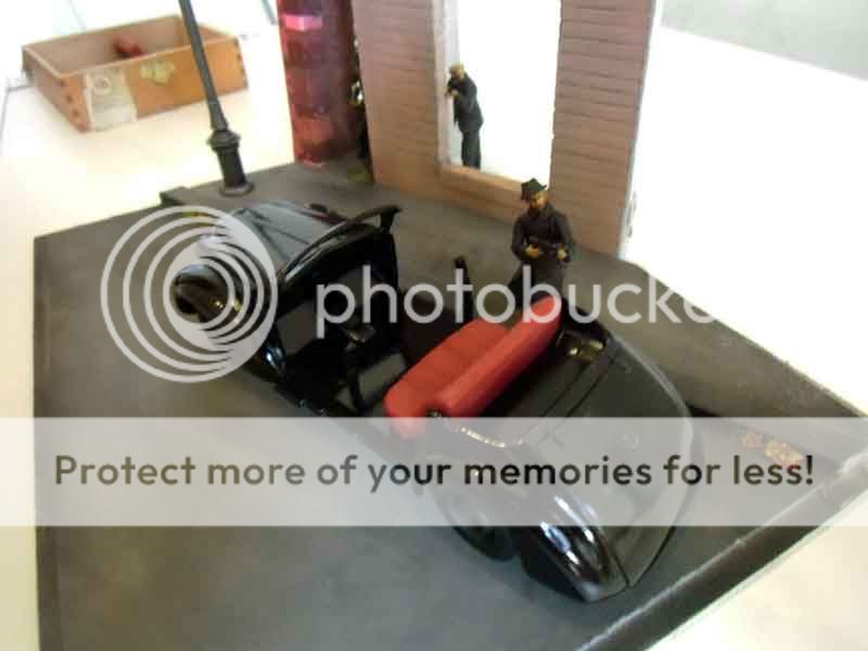 Der linke Spiegel hängt übrigens mit Absicht schief - ist ein Beschussschaden. Probehalber habe ich erst mal nur die linke Motorhaube montiert, bei der rechten bin ich noch am überlegen, ob ich sie hochklappe oder nicht.