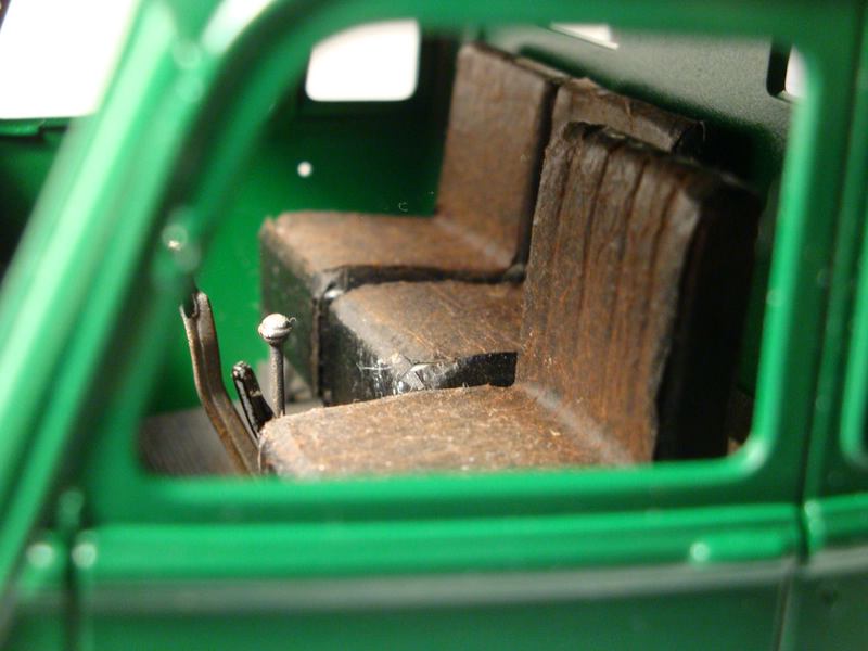 Anschließend hab ich die Sitzflächen und Rückenlehnen noch mit wasserverdünnter brauner Ölfarbe und Wattestäbchen vorsichtig abgetupft. Hier ist Vorsicht geboten, minimal zuviel Wasser weicht sofort die Klebestellen und das Papier auf.