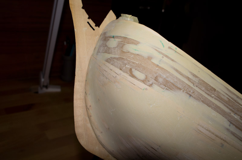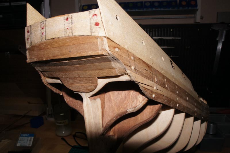 der letzte und vorletzte Spant könnte anhand der Fotos noch mehr gestrakt sein. Außerdem könntest du hier noch ein paar Füllhölzer einbauen. Was die Beplankung betrifft, was für ein Holz verwendest du? Sollten im Idealfall Abachi- oder Lindenleisten sein, die lassen sich gut biegen.