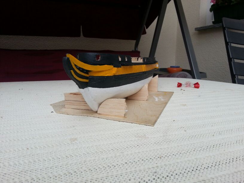 als erstes habe ich mir einen kleinen ständer gebaut, worin das Schiff bis zu 80° neigung immer noch hält.