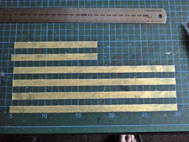 Aber auch das Maskiertape verliert so im laufe der Zeit seine geraden Kanten, hierzu schneide ich mir die Stücke, welche ich brauche ab, klebe sie locker auf meine Arbeitsunterlage und schneide einen ca. 1mm breiten Streifen ab und schon hat man wieder eine gestochen scharfe Kante.
