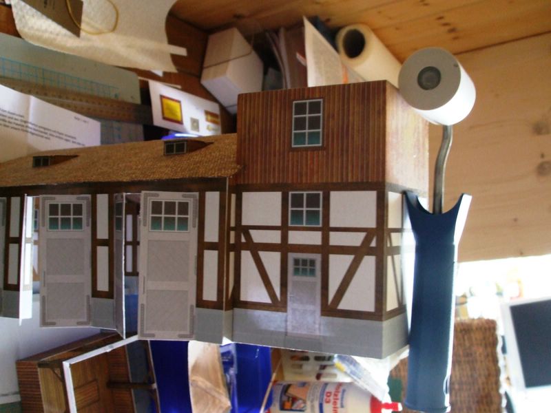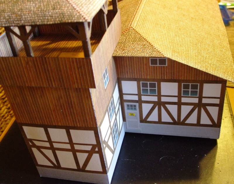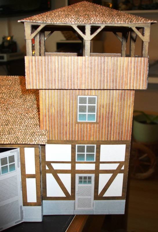 Zuerst habe ich, wie oben beschrieben, das Turmunterteil direkt an das Gebäude geklebt, in dem ich das Gebäudedach entsprechend ausgeschnitten habe. Danach kam das Turmdach auf das Turmoberteil und dann wurden die Turmteile verklebt.