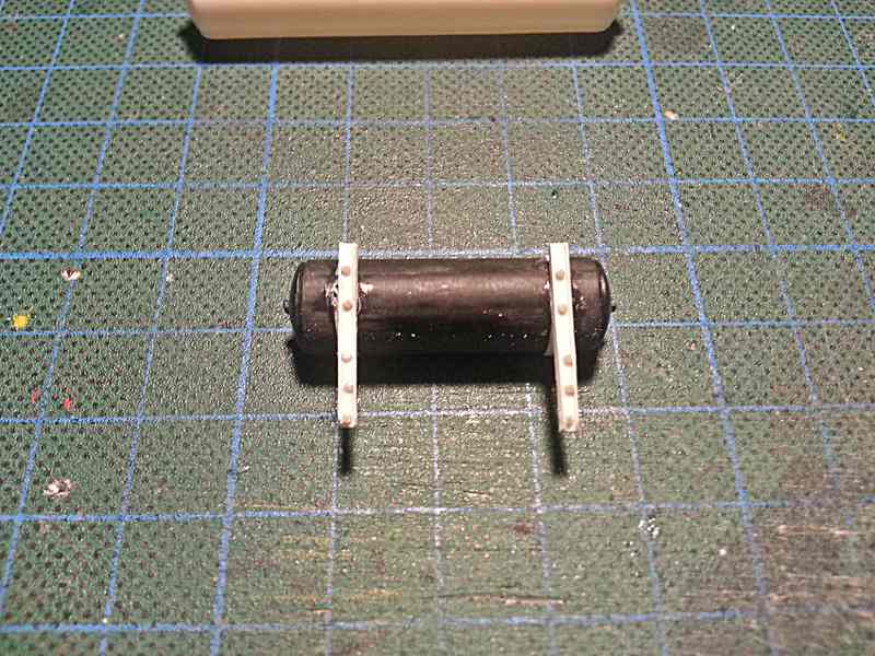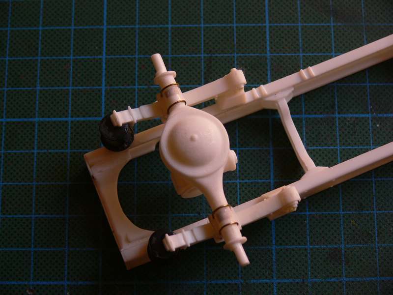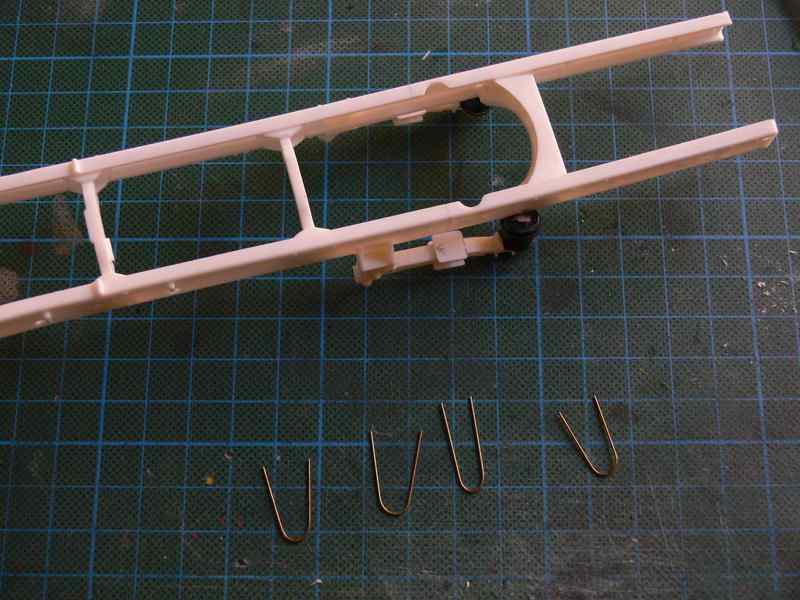 Dann wurden aus einem 0,5mm Sheetrest vier Halteplatten angefertigt und an die Federn geklebt, das gleicht dann auch die fehlenden 0,5mm in der Höhe aus. Zum späteren, zusätzlichen befestigen der Achse, habe ich mir noch die vier Briden, aus 0,5mm Messingdraht, gebogen, das sind diese U-förmigen Halteschellen unten auf dem nächsten Bild.