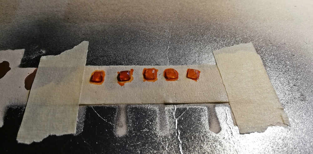 Heute Morgen, als hier alles trocken war, habe ich die Leuchten, aber nur lose auf das Dach gelegt. Angebracht werden sie aber erst nach dem hier noch eine Schicht Klarlack darüber kommt.