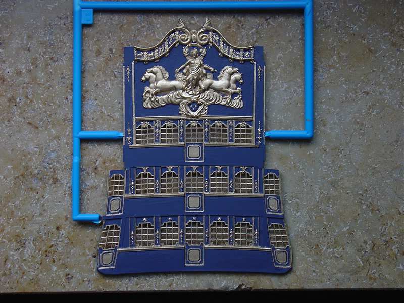 Vornehmlich bei der Bemalung der kleinen Figuren ganz oben war ich nicht zufrieden, obwohl.... Die Kamera konnte auch damals noch nicht die Unterschiede einfangen, aber das wird sich ändern... Wenn man aber dieses Schiff baut wird einem an verschiedenen Stellen sehr schnell klar gemacht, wo sich der Spreu vom Weizen trennt. Eine saubere Bemalung der kleinen Figuren oben am Heckspiegel ist wichtig, dort kann man eigentlich nichts gewinnen, aber sehr viel verlieren. ;-)