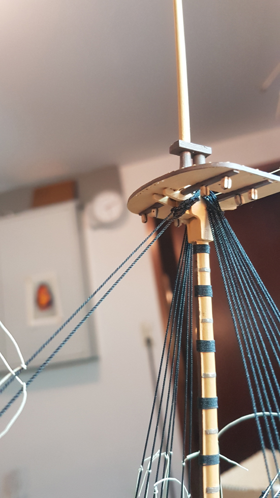 Diesmal sind sie mir nicht ganz so gleichmäßig gelungen wie am Großmast, aber ich kann vielleicht noch ein wenig beim finalen Verspannen korrigieren ...
