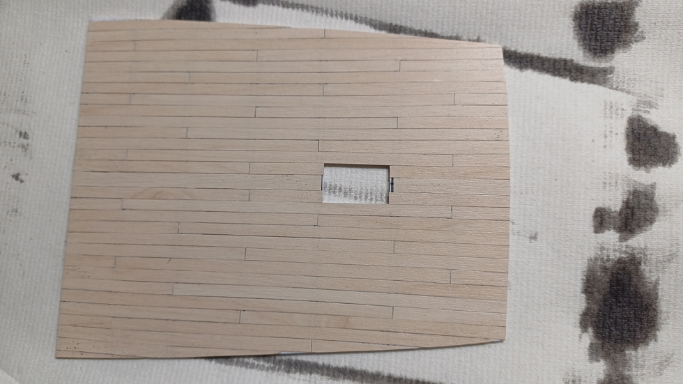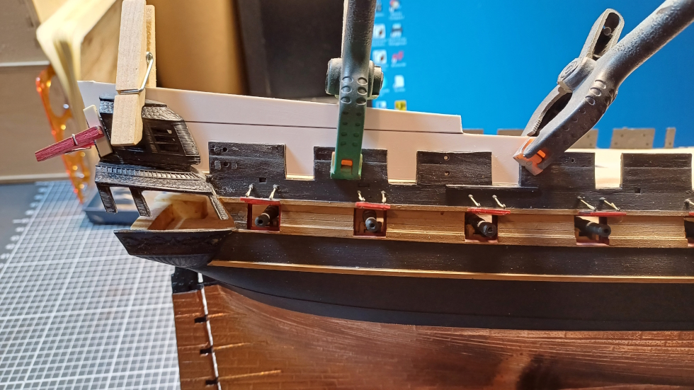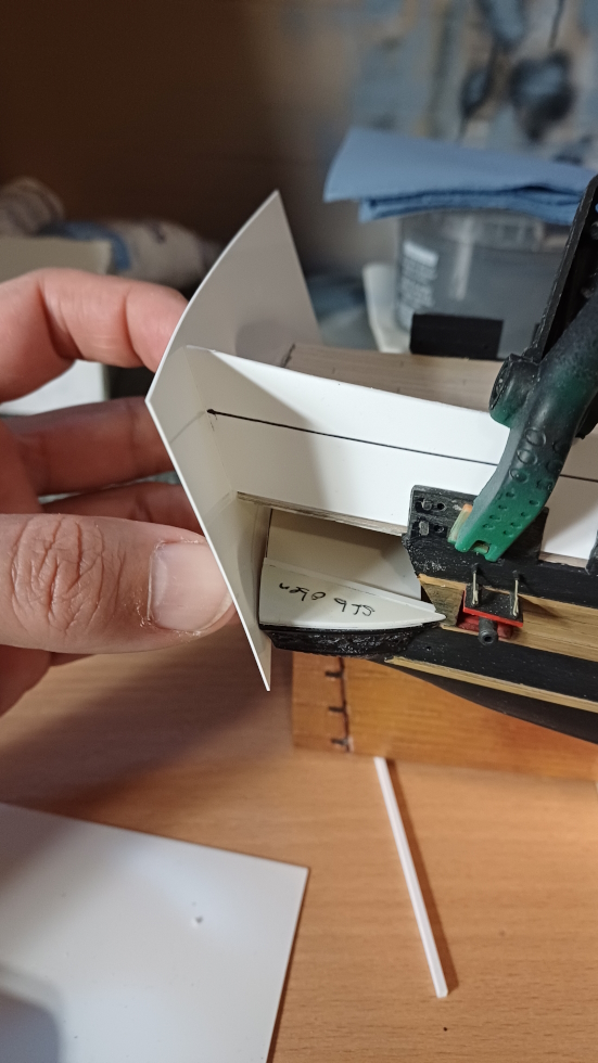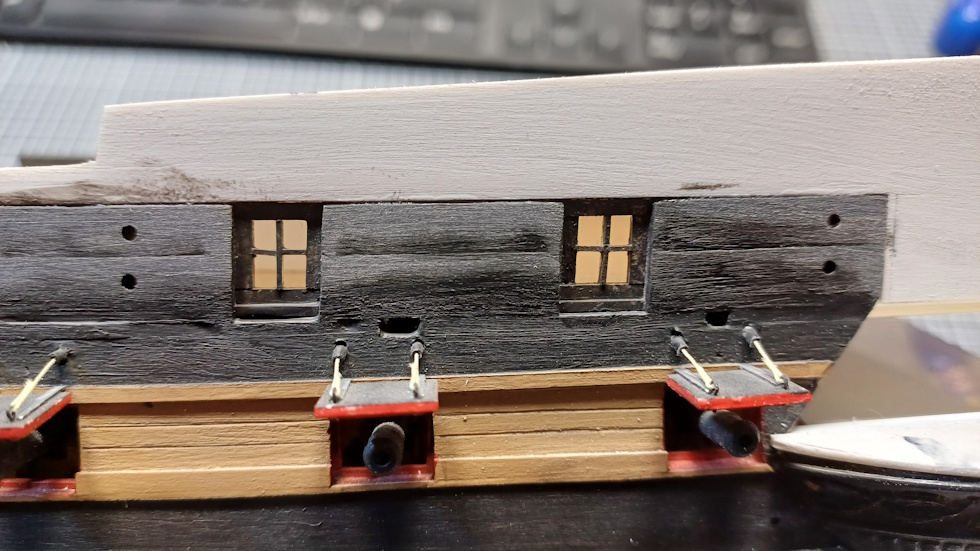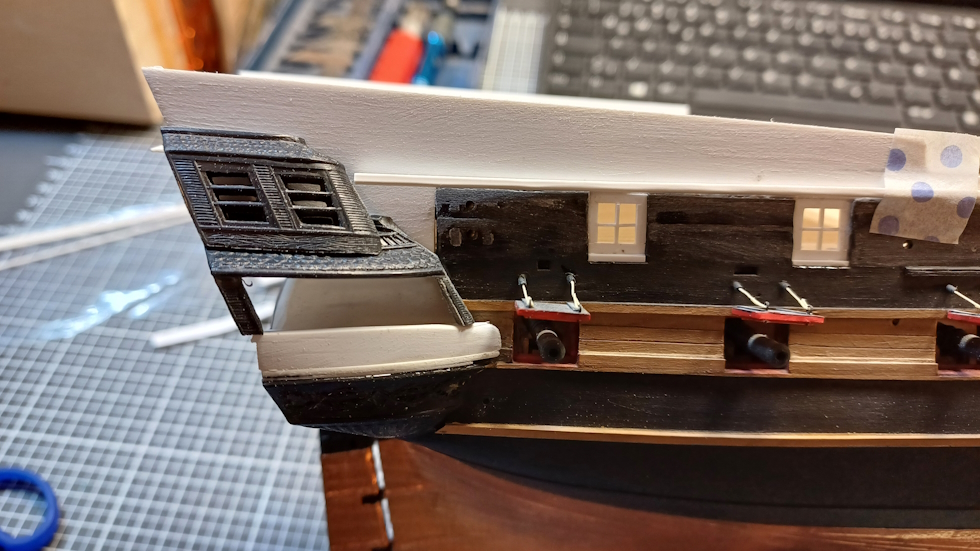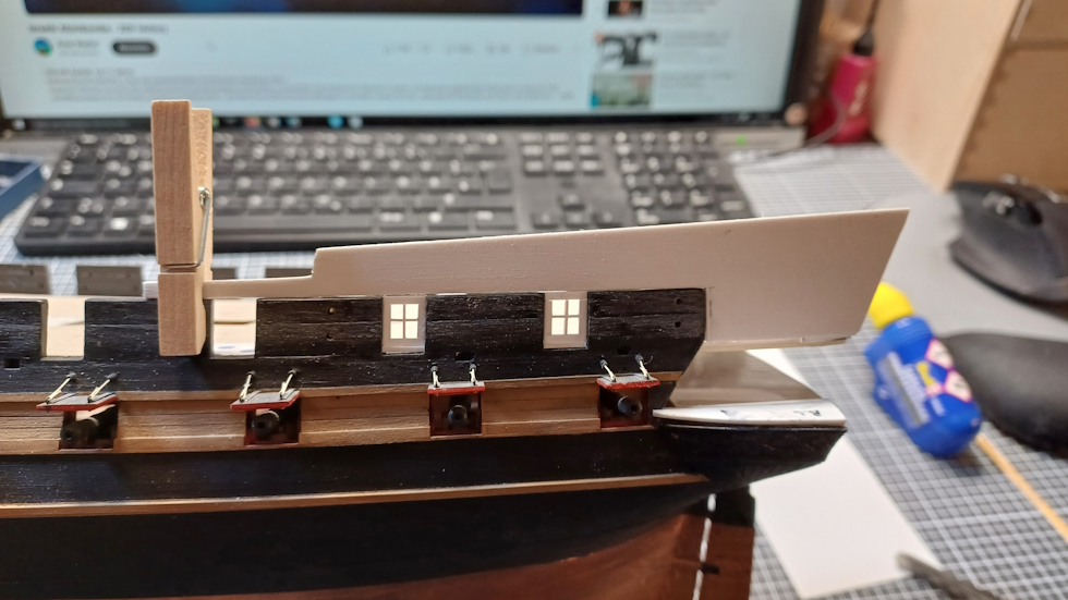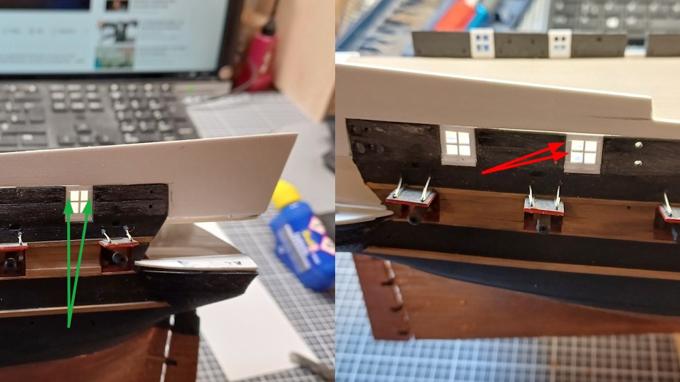 , fest verklebt. Zwei Stücke 2 x 2 mm und ein Stück 2 x 1mm Polyprofile übereinander geklebt und nach dem Aushärten an die Form der Seitentasche angepasst ergeben ein kleines Zwischenstück. Darauf kommt die untere Bausatzfensterreihe. Hier mal ein Bild, wohin die Reise geht:...Carpen lässt auf beiden Schiffen die Gefechtsschäden mit Bordmitteln soweit beheben, um die lange Fahrt nach Gibraltar antreten zu können, wo die Schiffe Mitte November eintreffen und vor Anker gehen.