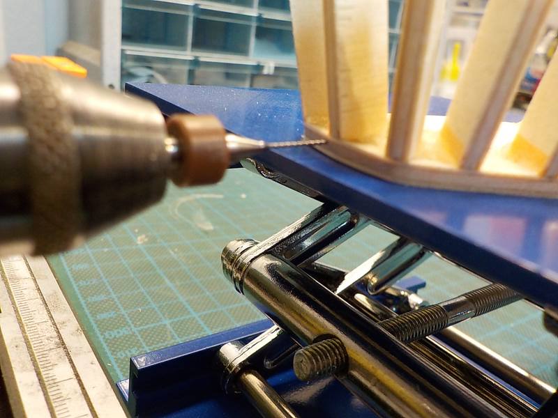 In diesem Fall ist es Bohren in die Schablone mit einem 0,5 mm Bohrer zur Aufnahme der Relingstützen – alle in exakt gleicher Höhe. Dies ist wichtig, um einen späteren Verzug der Reling zu vermeiden.