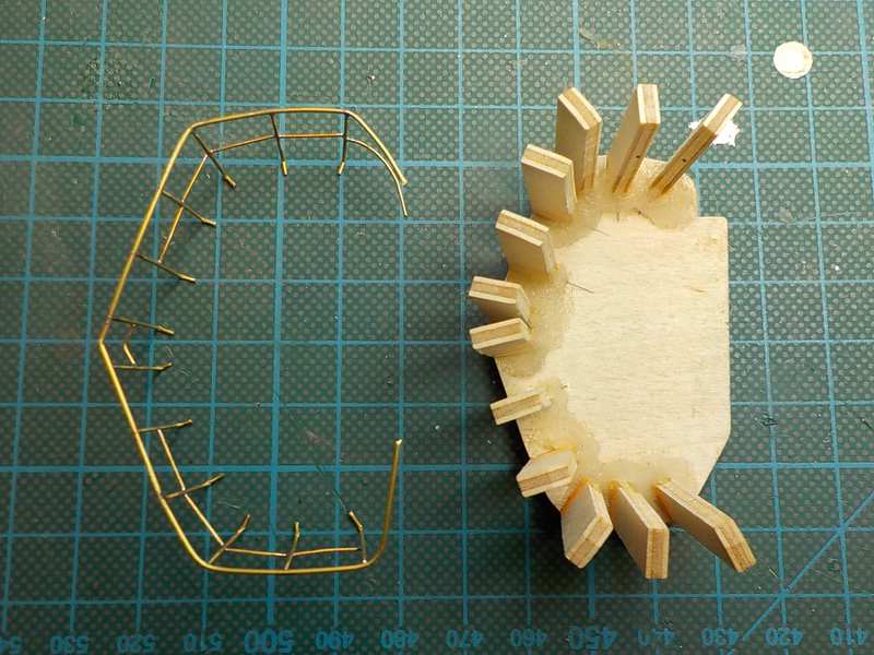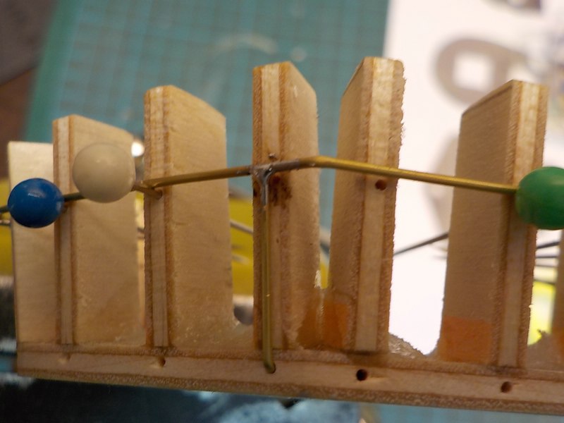 Die Relingsstützen sind aus 0,5 mm Messingrohr. Jede Stütze wird einzeln gefertigt -akribisch unten gebogen und oben abgelängt.