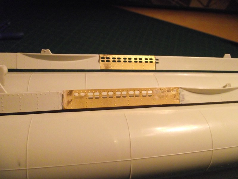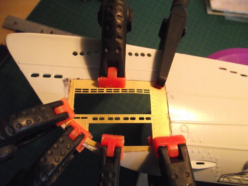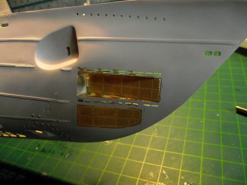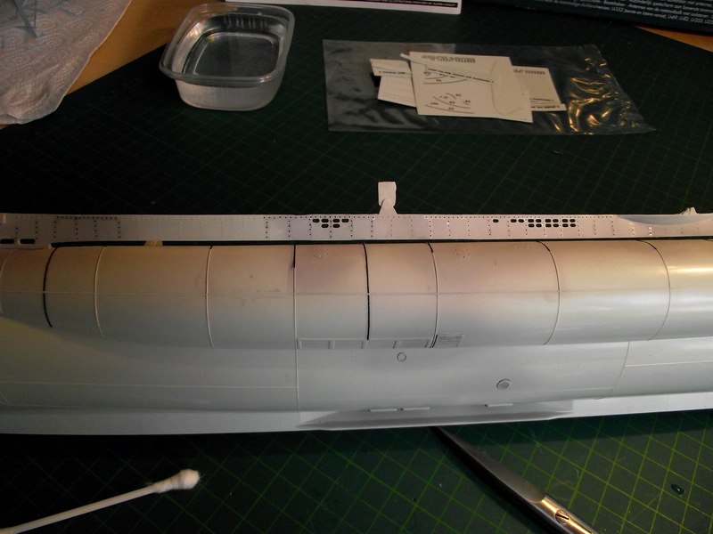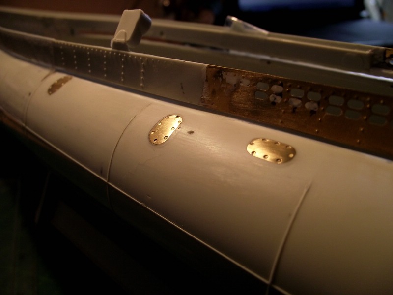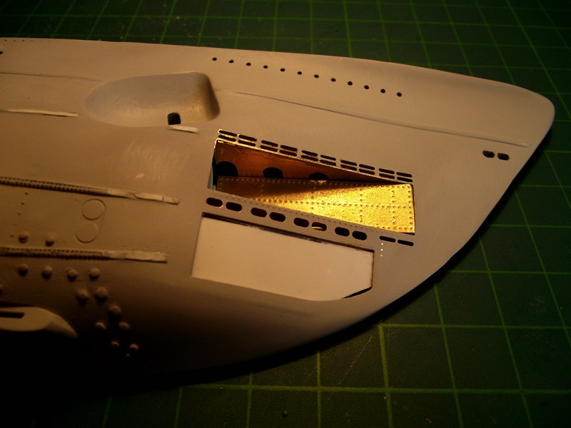 Jetzt mussten die Messingteile von WEM angepasst werden an das Boot (Torpedoklappen und die Flutschlitze am Bug sowie am Heck unterhalb usw)