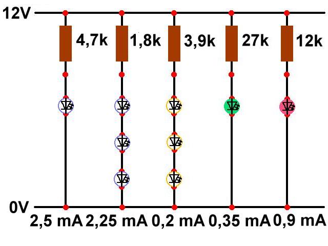 Die warm-weissen - drei in Reihe geschaltet bekommen den 3,9 kOhm Widerstand davor (Orange, Weiß, Rot).