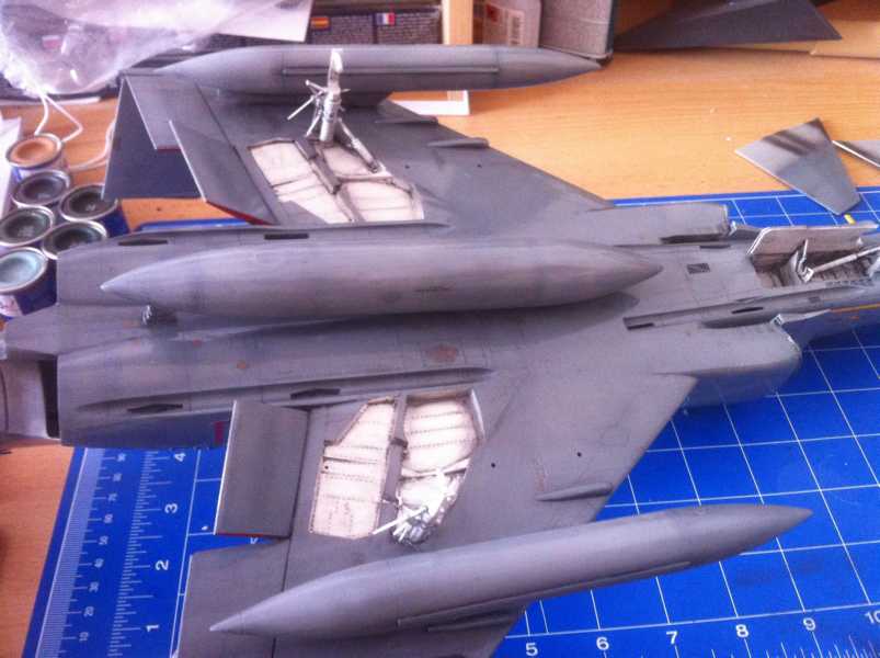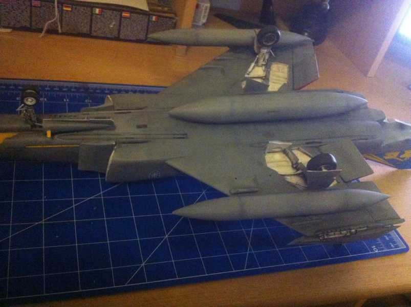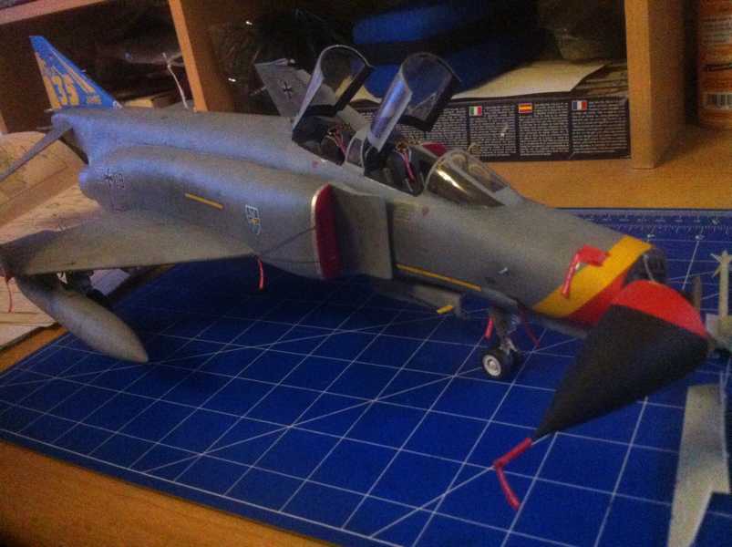 PS.: Hab mal eben nen bischen gegoogelt. Fand auch nen paar Bilder Deiner Maschine. Danach sieht es so aus : Centerlinetank angebaut , Unterflügeltanks u. deren Aufhängung abgebaut + Pylone u. Raketenracks angebaut ,jedoch ohne Raketen.