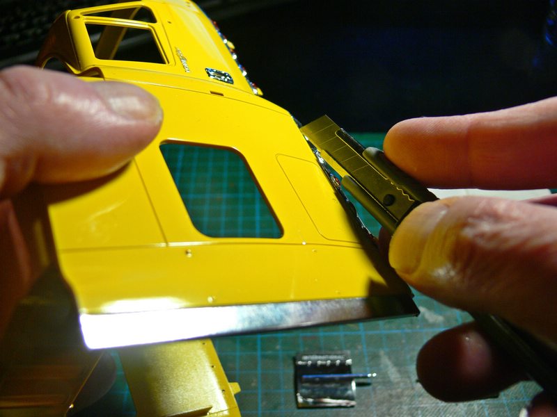 Also wird es etwas knifflig, alle Klebepunkte bekommen erst mal Klebstoff, dann wird der Motor mit vorsichtigem Druck von oben in das Fahrgestell gedrückt. Nun zuerst den Kardan und die Auspuffleitung mit dem Schalldämpfer verbinden, Den Motor dann vorne etwas anheben und den Kühler in seine Nuten, links und rechts drücken, dabei dann das Lüfterrad mit dem Motor verbinden und alles zusammen nach unten drücken. Das ist genauso Haarig wie es sich hier liest, aber es hat funktioniert!