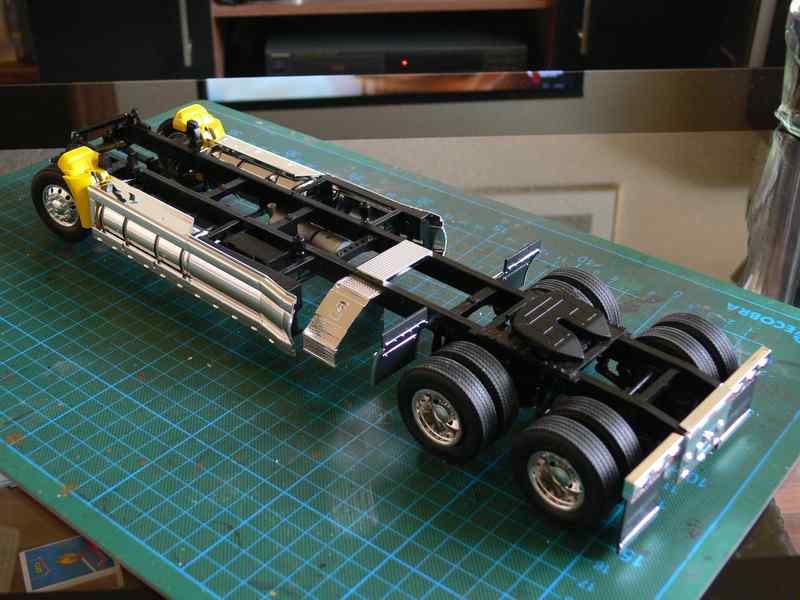 Man müsste, um dieses Einheit komplett zu montieren, das schon machen bevor die Vorderachse und die vordere Strebe mit der Haubenhalterung angebaut wird. So könnte man das Fahrgestell vorne etwas spreizen und den Motor mit Kühler von vorne einschieben.