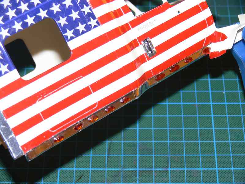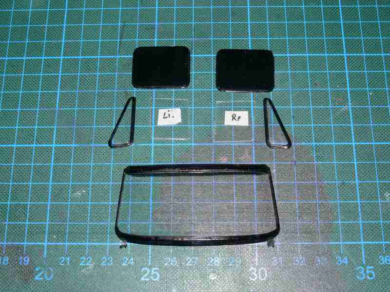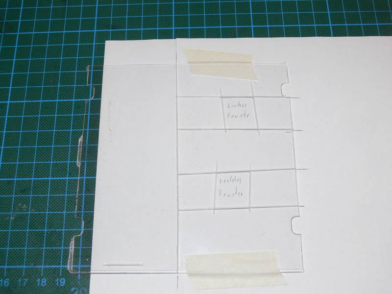 Zwei neue Seitenscheiben wurden noch aus einer DVD Klarhülle angefertigt, die Fenster selber hatte ich mir wieder auf Papier übertragen, dann das klare Plastik darüber fixiert und mit dem Cuttermesser angerissen. Dann wurden die überflüssigen Teile vorsichtig abgebrochen, so ähnlich wie man es ja auch mit echtem Glas macht.