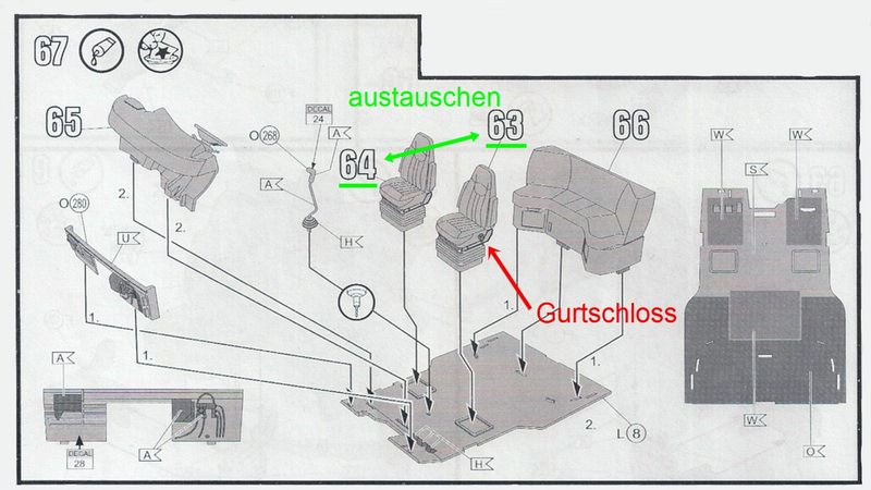 Kommen wir zu dem schon angesprochenen Fehler in der Bauanleitung. Wenn man die Sitze wie in den Baustufen 63 und 64 zusammengebaut hat, wird man etwas später auf die Baustufe 67 treffen, hier geht es nun um den Einbau der Sitze und wer genau hin schaut, wird da schnell feststellen so geht das aber nicht. Der Sitz aus Baustufe 63 wird nun zum Fahrersitz, aber das Gurtschloss liegt dann außen an der Tür, analog dazu der andere Sitz.