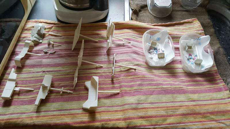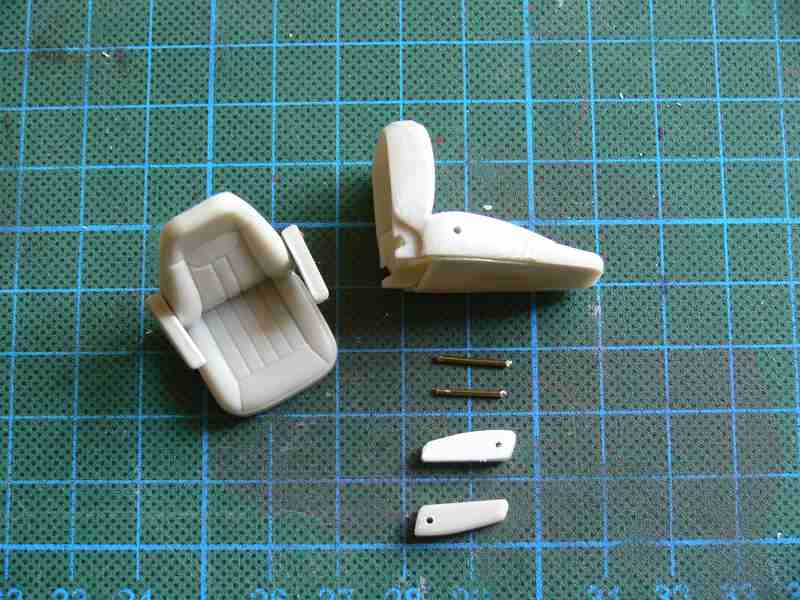 So nun aber zuerst die Einzelteile der Sitze, ist nicht viel. 2 Teile für die Gestelle, die sind schnell zusammen geklebt und je 2 Teile für die Sitze selber, sehr schön das man hier an einen Rücken gedacht hat, den man nicht selber bauen muss.